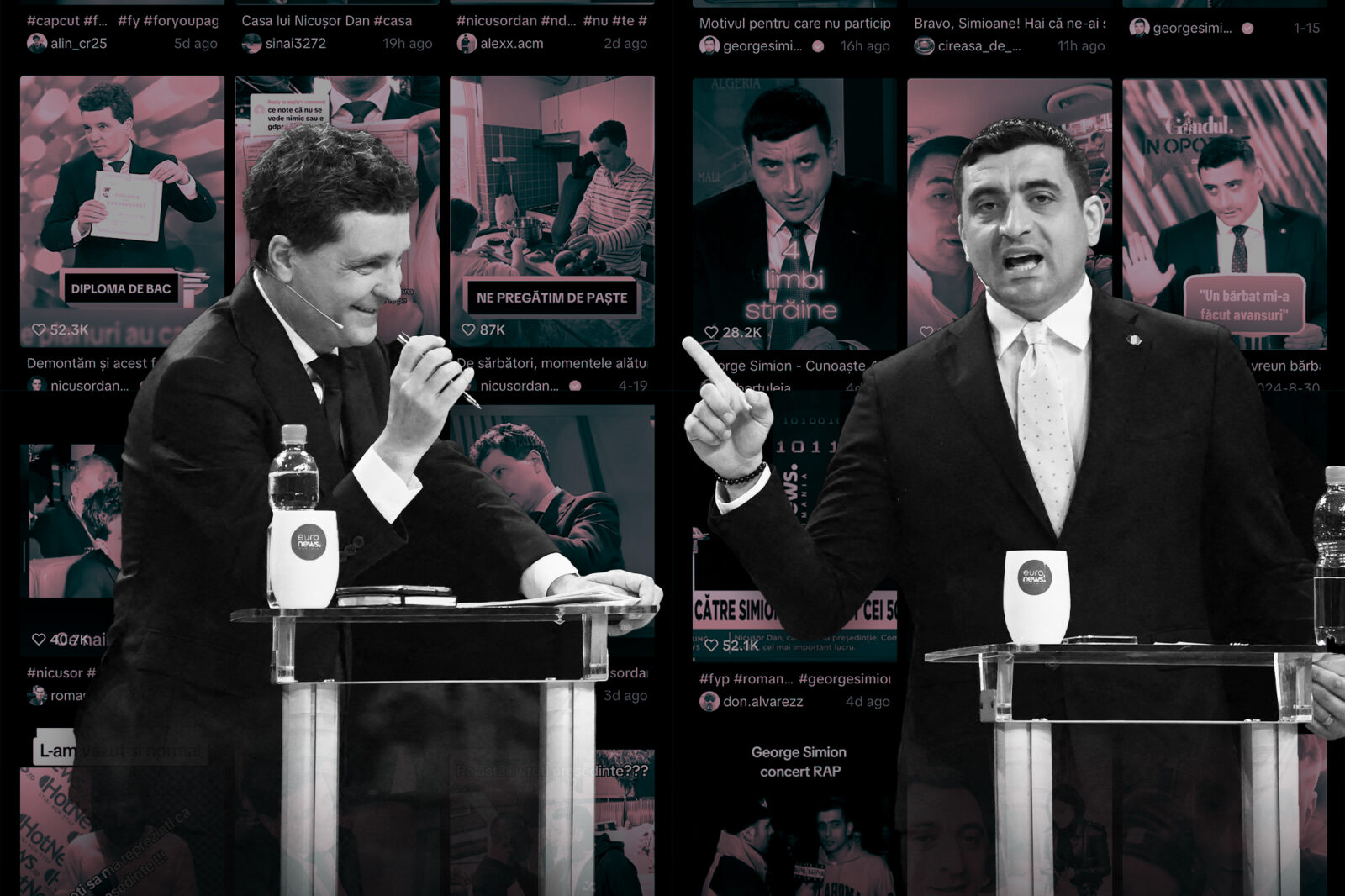 Telefonul filmează un grup de oameni care sărbătoresc că vor vota pentru George Simion. „Ești de-al nostru, Simioane”, îi strigă ei. Ecranul se împarte în două și un influencer îi arată cu degetul, insistând pe ideea că Simion e urmat de către cei din etnia lui: ”***nii, ***nii!”. Imediat apare un alt videoclip scurt, cu Nicușor Dan vopsit pe față în roz și căruia un soft i-a adăugat o fustiță scurtă. Un alt influencer, de data asta al lui Simion, îi blestemă de Dan și pe susținătorii săi: „Niște c***. Ei ne vor schimba sexul copiilor”.